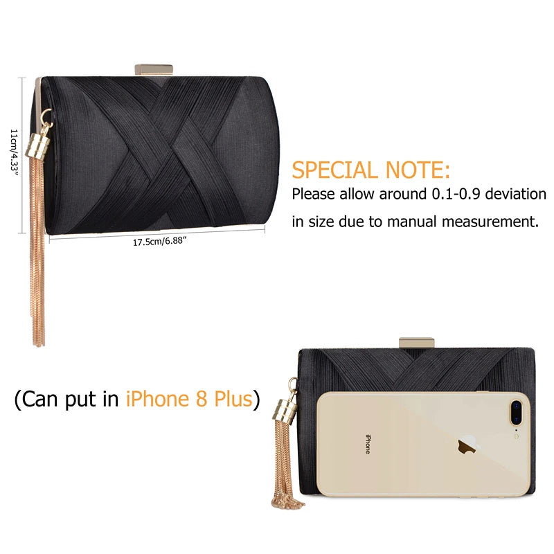 The Morgan is a sophisticated minaudiere clutch that seamlessly transitions from day to evening occasions. Crafted from premium polyester with a distinctive woven texture, this structured handbag features an elegant metal tassel and secure hasp closure for reliable everyday use. The criss-cross detailing adds visual interest, while the interior cell phone pocket ensures practical organisation. Measuring 17cm x 7cm x 10cm, this compact yet spacious design suits formal events and casual outings alike. Available in eight refined colours—black, gold, silver, blue, green, pink, purple, and champagne—the Morgan pairs effortlessly with any wardrobe. The detachable chain shoulder strap provides versatile carrying options, making it an essential accessory for the modern woman who values both style and functionality.